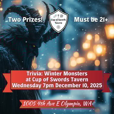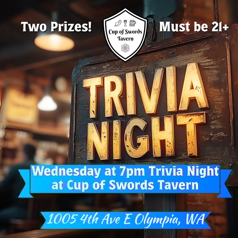 Join us at Cup of Swords Tavern for a trivia night like no other! Don your garb, gather your friends, test your knowledge, and compete for two epic prizes. Costumes, camaraderie, and cold drinks await. Don’t miss this night of revelry!