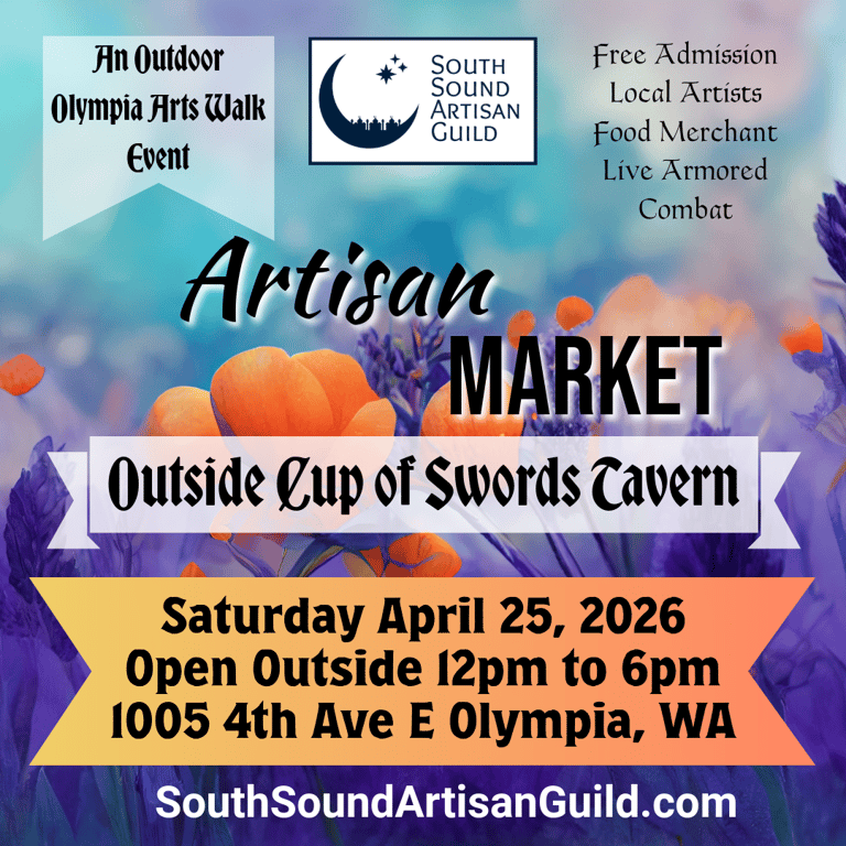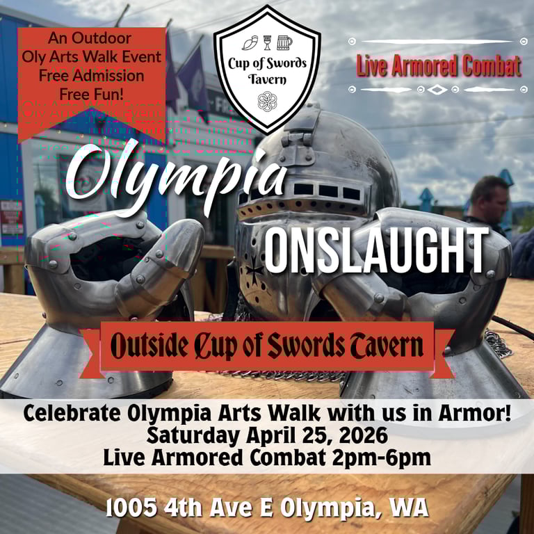 Welcome to the Olympia Arts Walk SSAG Artisan Market at Cup of Swords Tavern! There will be a variety of skilled craftsmen and merchants, food, music, and fun! Olympia Onslaught will be there to perform live armored combat outside from 2pm - 6pm. Centrally located in downtown Olympia on 4th Ave, you won't want to miss this fun filled outdoor event. The artisan market is all ages, however, you must be age 21+ to enter Cup of Swords Tavern.