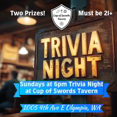 Join us at Cup of Swords Tavern for a trivia night like no other! Don your garb, gather your friends, test your knowledge, and compete for two epic prizes. Costumes, camaraderie, and cold drinks await. Don’t miss this night of revelry!